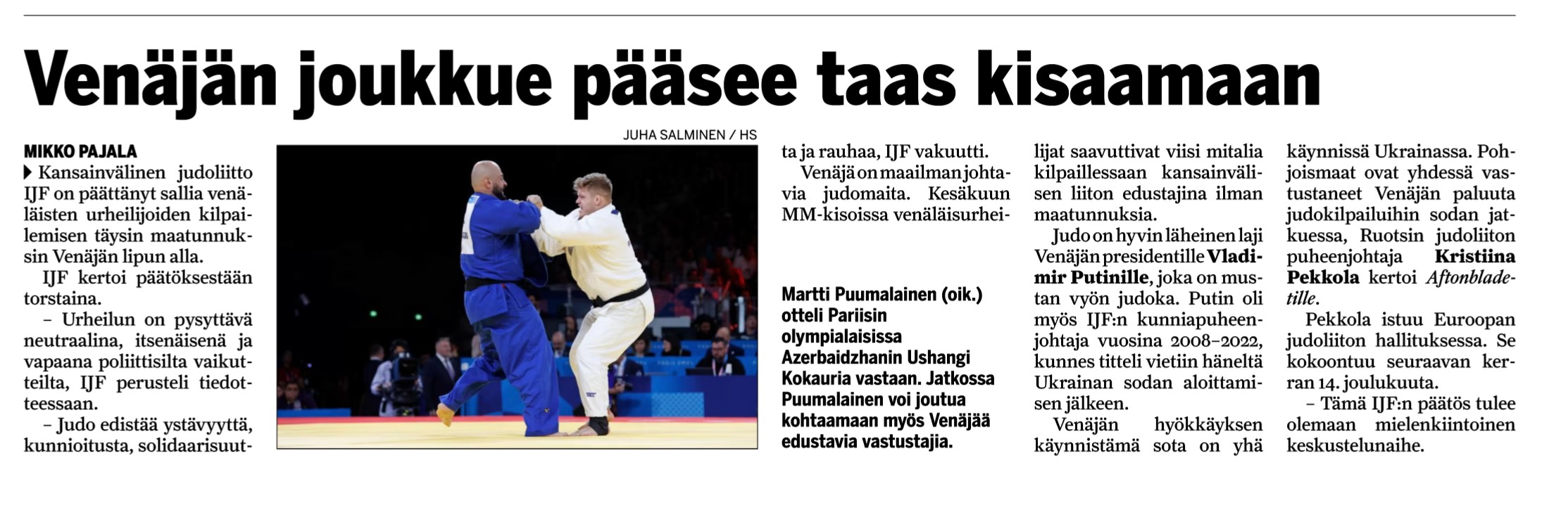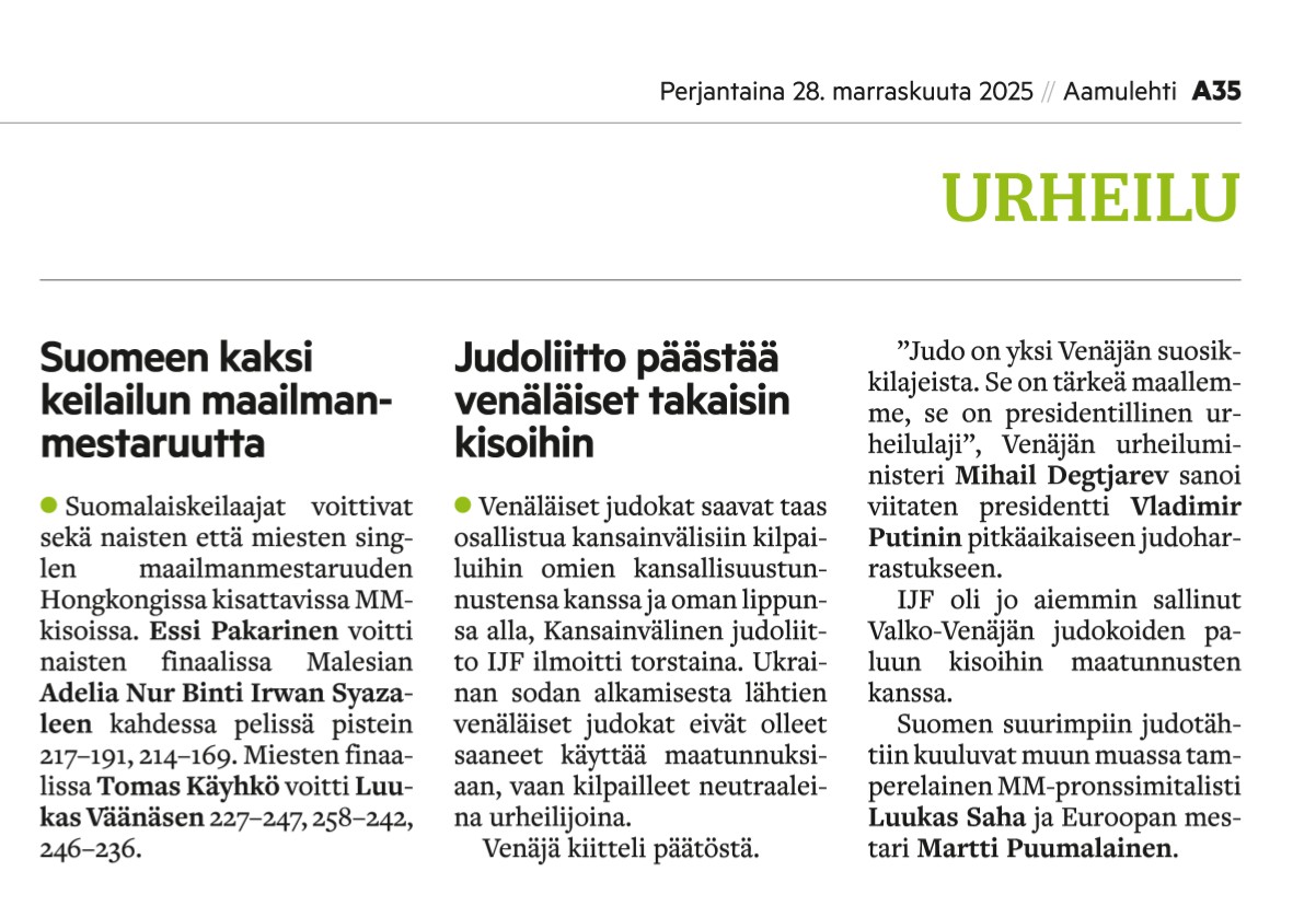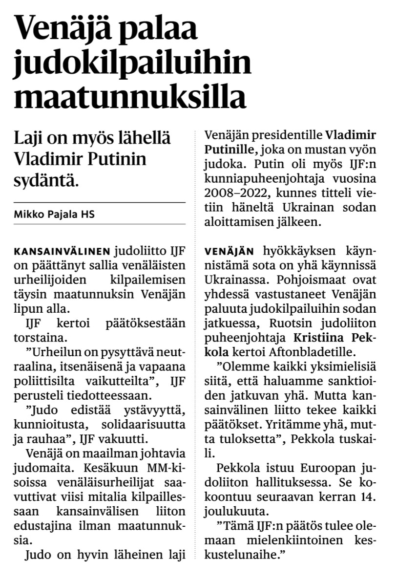 hs.fi 27.11.2025: Judo: Pohjoismaiden vastarinta ei auttanut – Venäjä palaa kilpailuihin | HS.fi