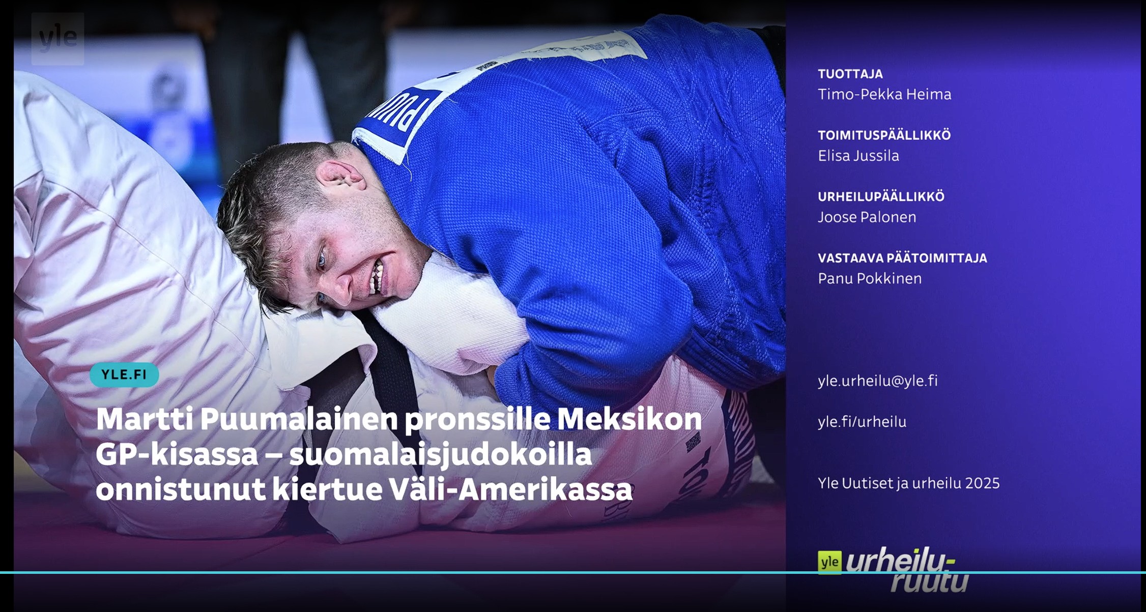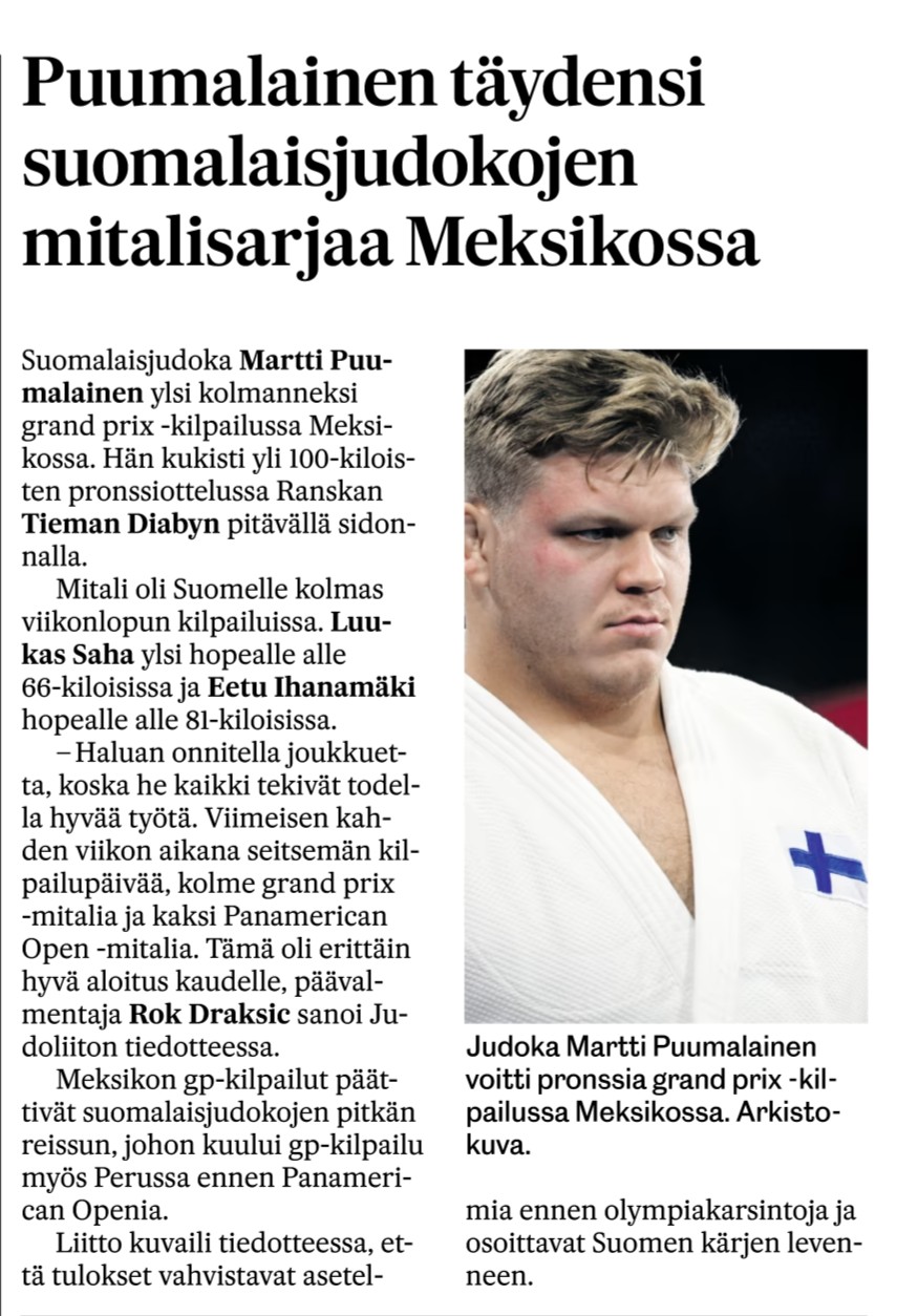 YLE.fi 20.10.2025: Martti Puumalainen pronssille Meksikon GP-kisassa – suomalaisjudokoilla onnistunut kiertue Väli-Amerikassa | Urheilua lyhyesti | Yle