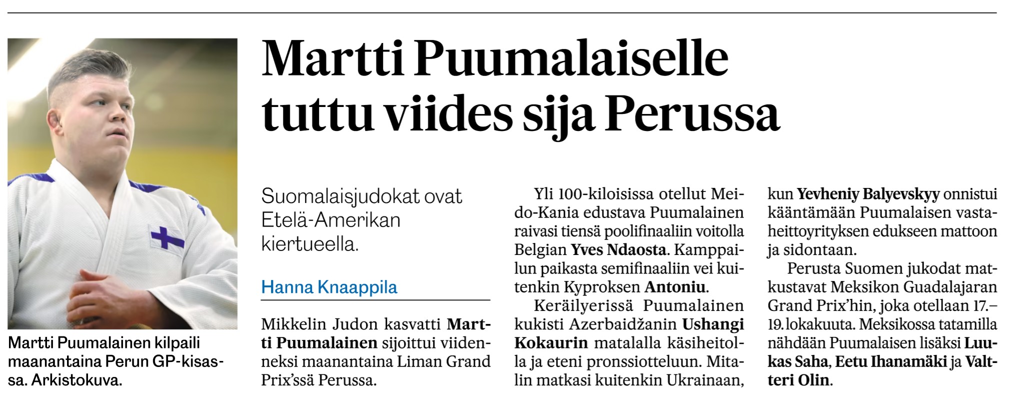 judoliitto.fi 14.10.2025: Liman Grand Prix: Martti Puumalainen viides – Emma Krapu seitsemäs – Suomen Judoliitto ry