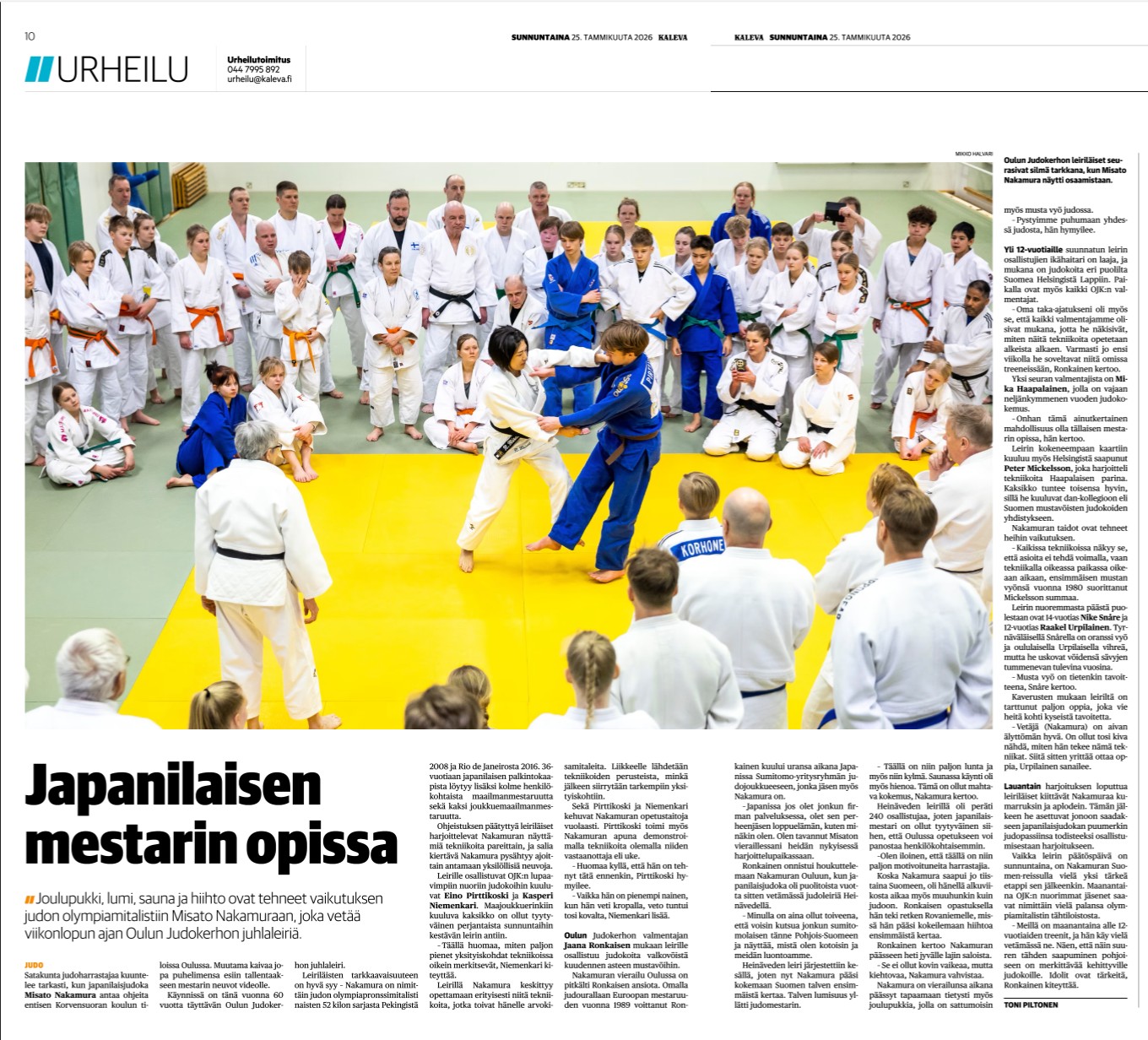 kaleva.fi 24.1.2026: Joulupukki, lumi, sauna ja hiihto ovat tehneet vaikutuksen olympiamitalistiin – Japanilainen Misato Nakamura vetää Oulun Judokerhon juhlaleiriä | Kaleva