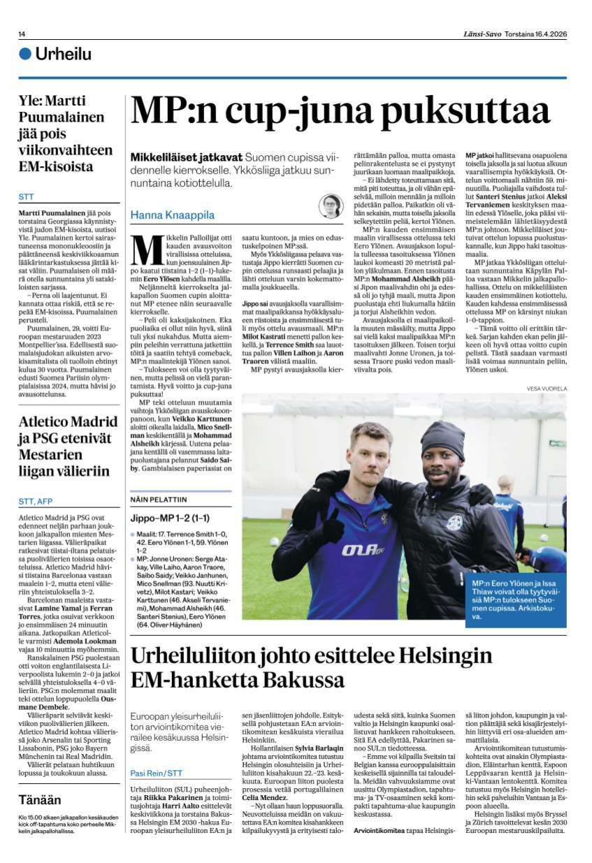 lansi.savo.fi 15.4.2026: Yle: Sairastuminen pitää Martti Puumalaisen poissa viikonvaihteen EM-kisoista | Urheilu | Länsi-Savo
