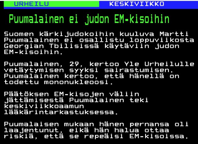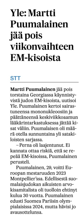 yle.fi 15.4.2026: Martti Puumalainen vetäytyy judon EM-kisoista sairastumisen vuoksi – pernan repeämisen riski | Urheilu | Yle